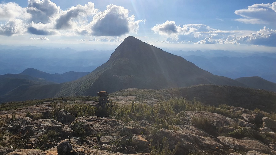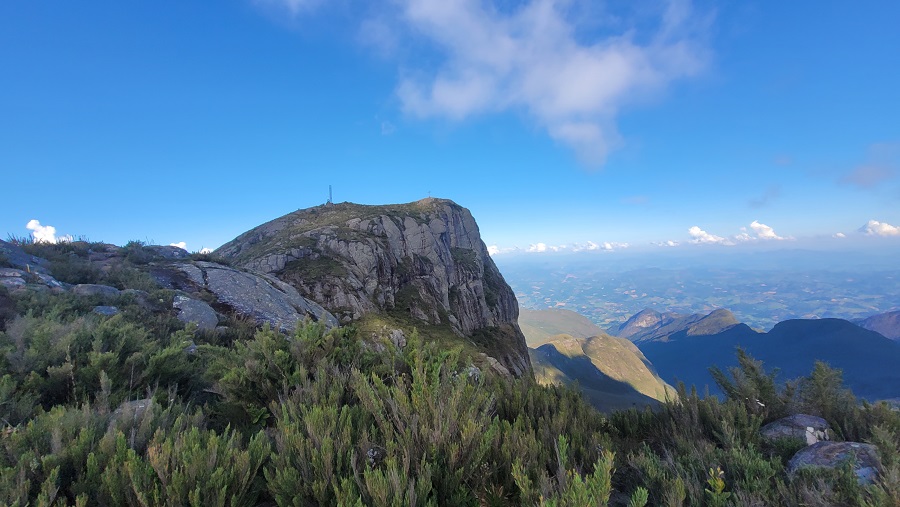 O Pedra Roxa é a 13ª maior montanha do Brasil, com 2.649 metros de altitude, e tem um visual muito bonito do Pico da Bandeira. De frente ainda vemos o Tesouro, Tesourinho e a Cruz do Negro.