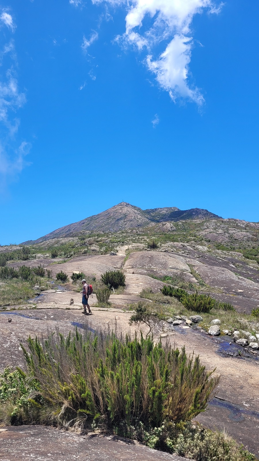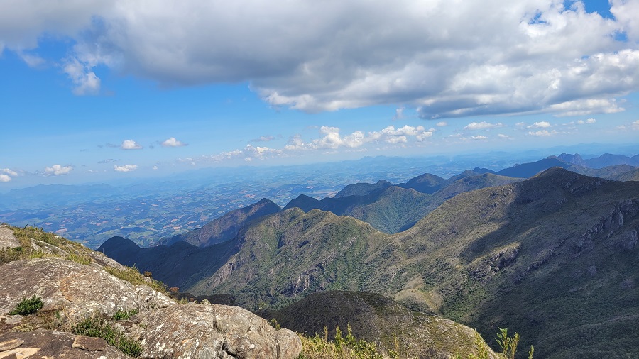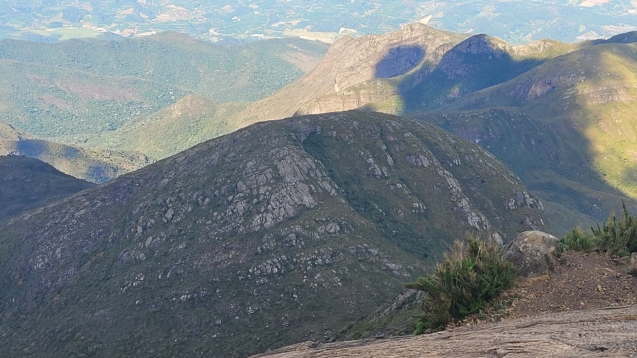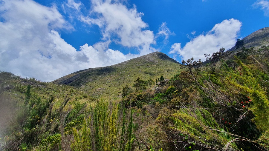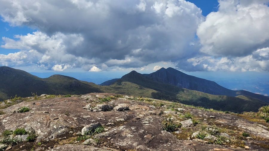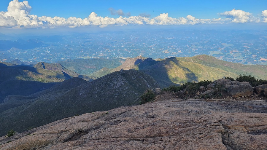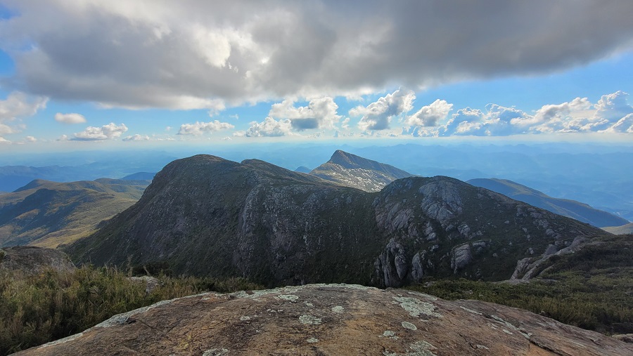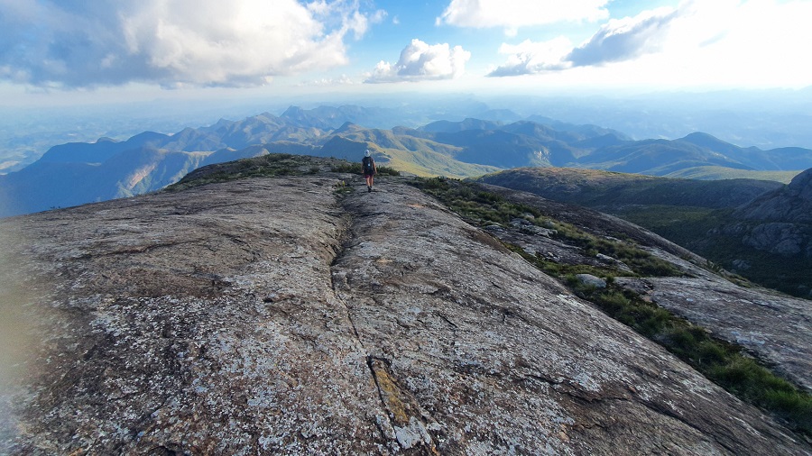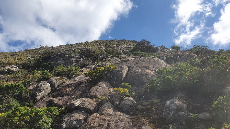 Seguindo em direção ao cume do Pico da Bandeira, a trilha continua bem batida e com sinalização clara praticamente o tempo todo. Existe um trecho mais íngreme, com várias rampas diretamente na rocha, até que começamos a avistar o cume do Bandeira e as montanhas ao redor.