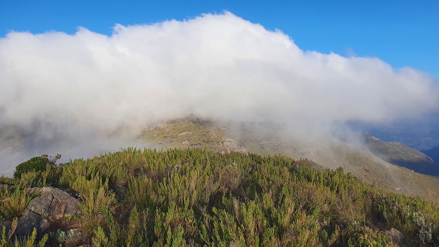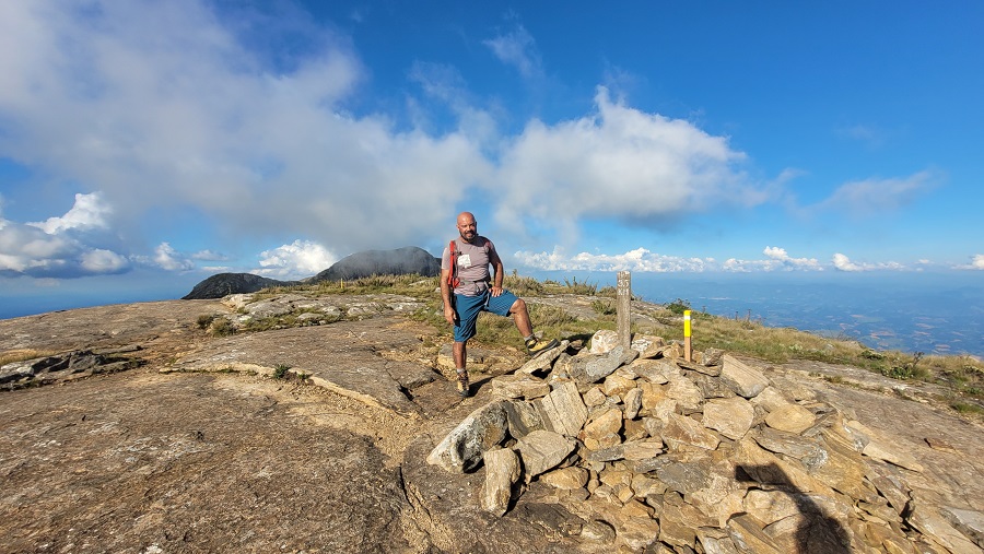 Às 15h50, depois de 1h30 de caminhada, chegamos ao cume do Pico da Bandeira. Dia bonito, com visual aberto, mas com cara de que poderia fechar a qualquer momento.