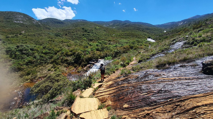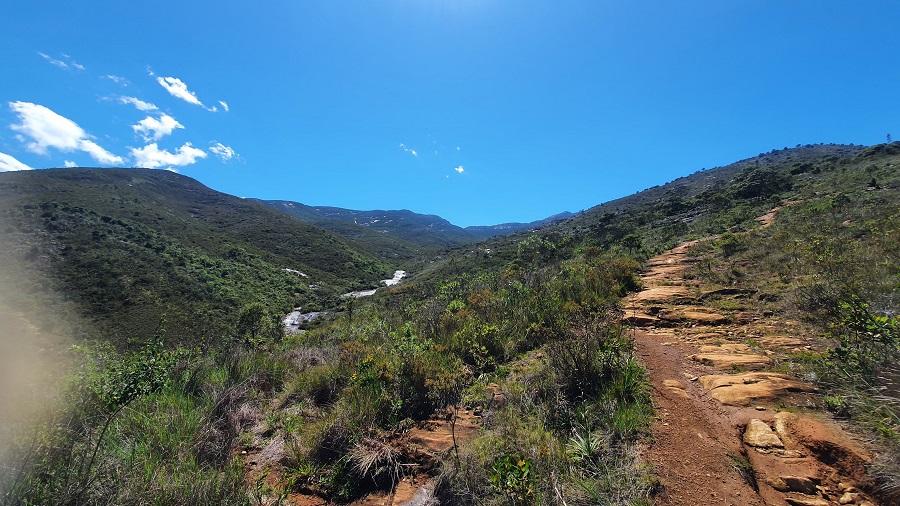Caminhávamos em um ritmo constante, sem exagerar. O dia seria longo e tínhamos bastante coisa pela frente. A trilha acompanha um rio muito bonito, com vegetação baixa e visual o tempo todo.