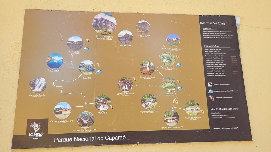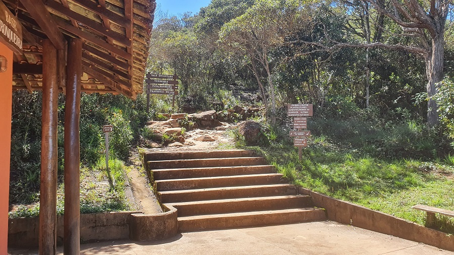 Depois da preparação básica — conferir equipamentos, passar protetor solar e organizar a mochila — começamos a caminhar por volta das 9 horas da manhã. O parque é muito bem estruturado e tem placas informativas para tudo. O início da trilha é bem marcado e sinalizado.