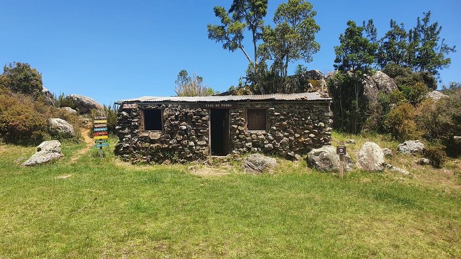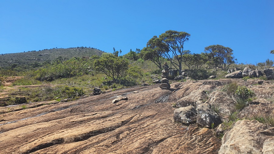 Comemos algo mais reforçado antes de seguir. Eu lembrava que a orientação até o Bandeira deveria ser mais tranquila, com vários totens de pedra marcando o caminho.