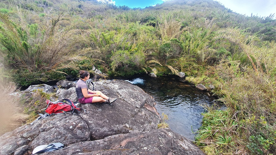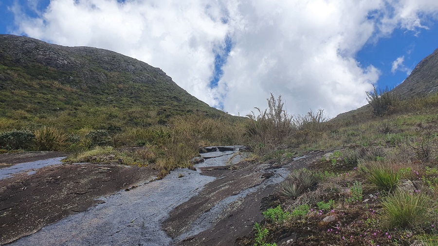 A descida até o vale antes do Pedra Roxa foi tranquila. Cruzamos um riozinho e abastecemos água novamente. A partir dali o caminho ficou ruim, sem lógica, entrando num mato horroroso de caminhar, enquanto do lado esquerdo eu via claramente uma encosta de pedra limpa, perfeita para progredir.