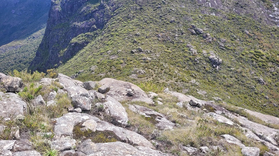Saindo do cume, existe um rastro de trilha visível, mas nada muito evidente. No colo entre as montanhas não encontramos nenhuma sinalização clara. Observando de onde estávamos, a subida se mostrava muito íngreme, quase vertical em alguns pontos. Resolvi seguir pela direita desse trecho.